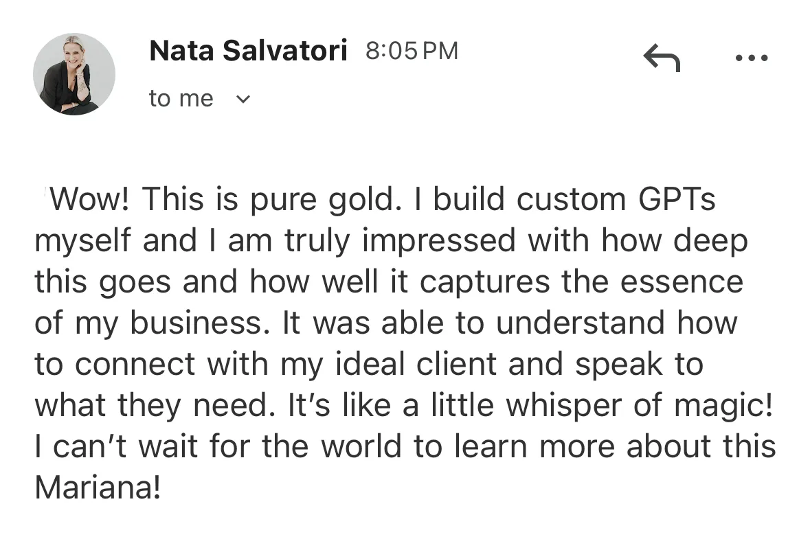 And here’s the kicker: You’ll teach your GPT to reflect YOUR unique voice and vibe and speak to YOUR audience very time.