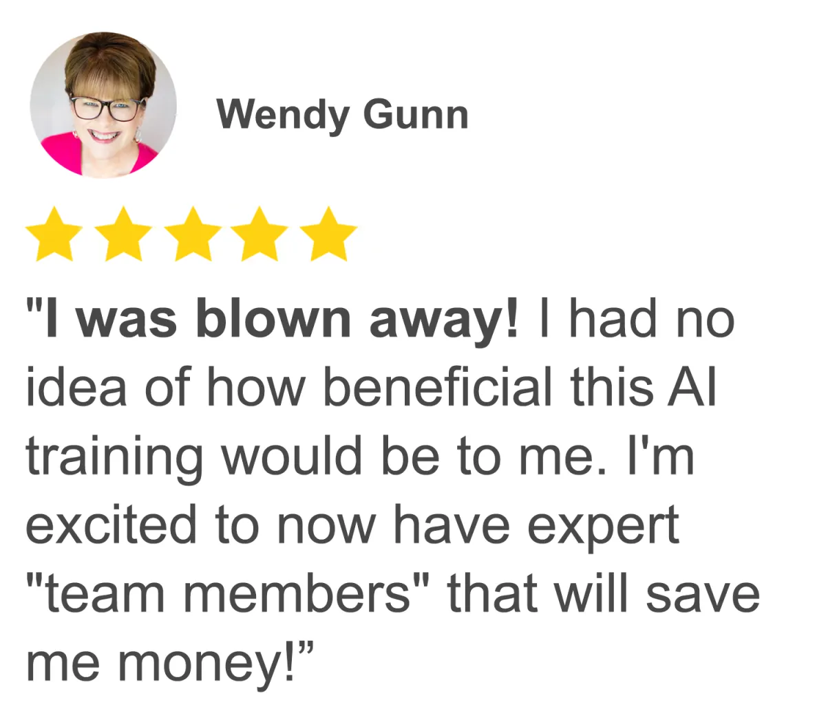 I had no idea of how beneficial this training would be to me and I'm excited to create my own team of AI assistants. It's amazing how much knowledge Mariana has on this subject - she is a wealth of information and experience, and she made it so easy!"